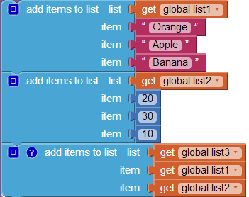 In the above image, we used "make a list" block to create a list named myList with three items - Apple, Banana, and Guava. If we didn't put any item in the make a list block, it would create an empty list just like the way we did with create empty list block. Note that, you can put as many items as you want in make a list.